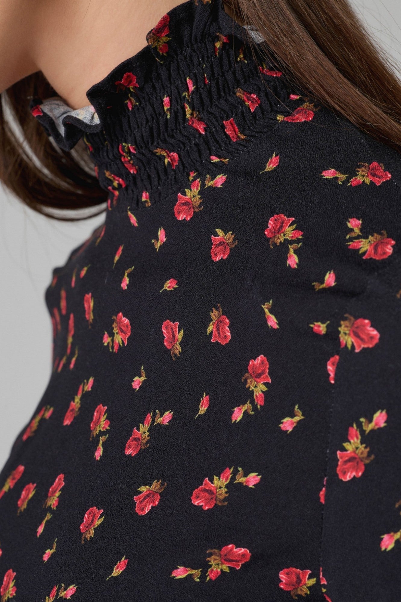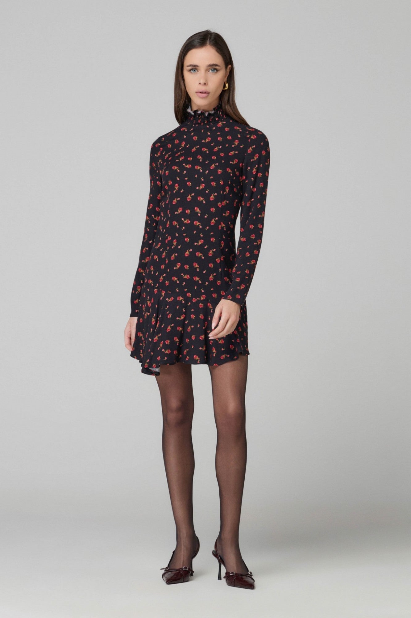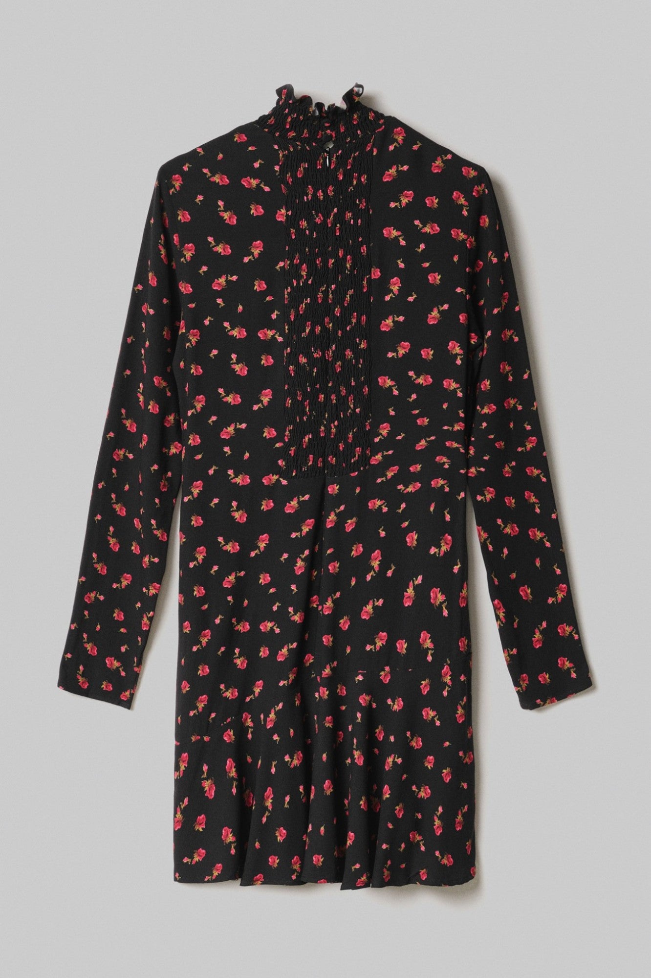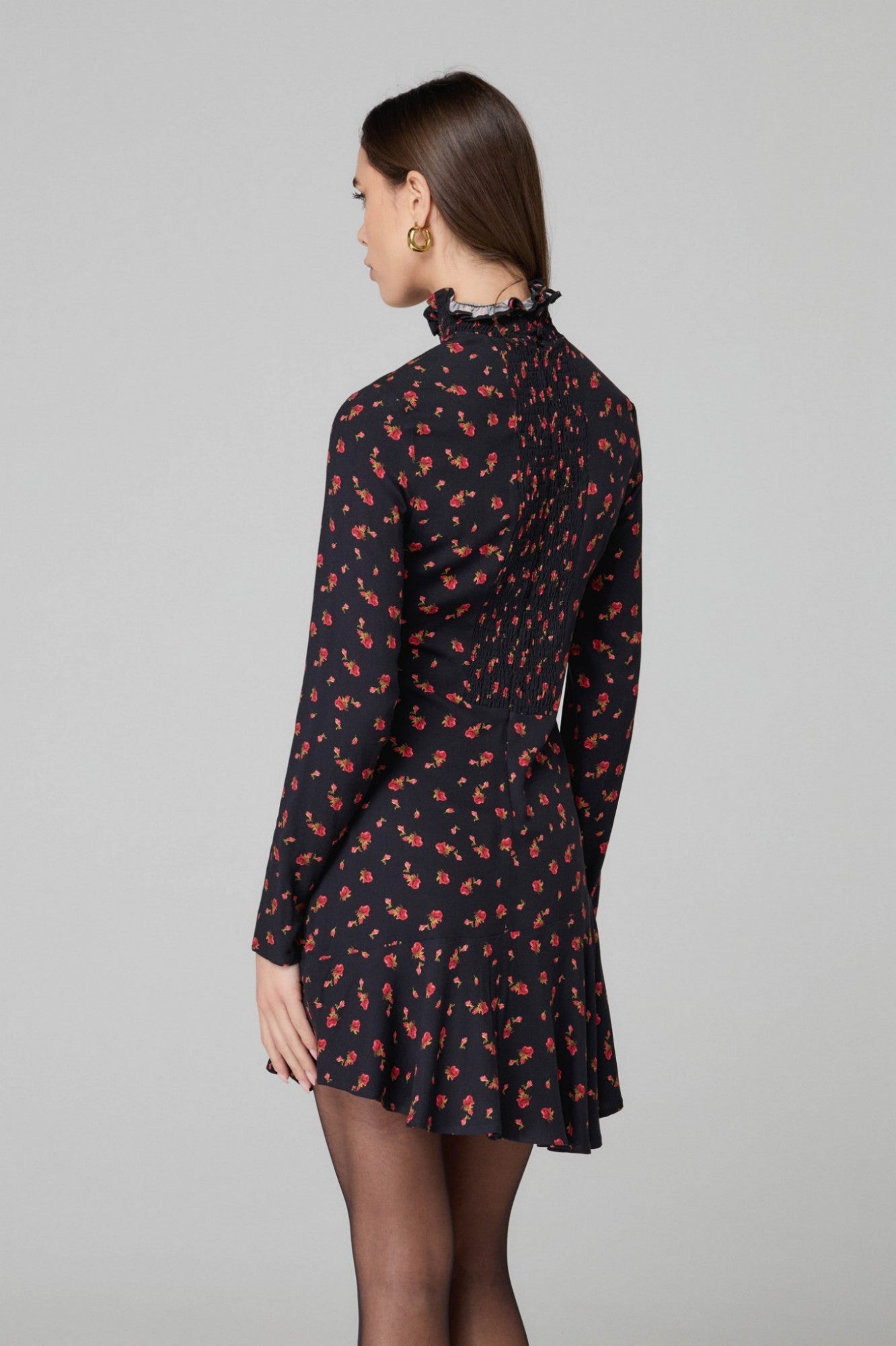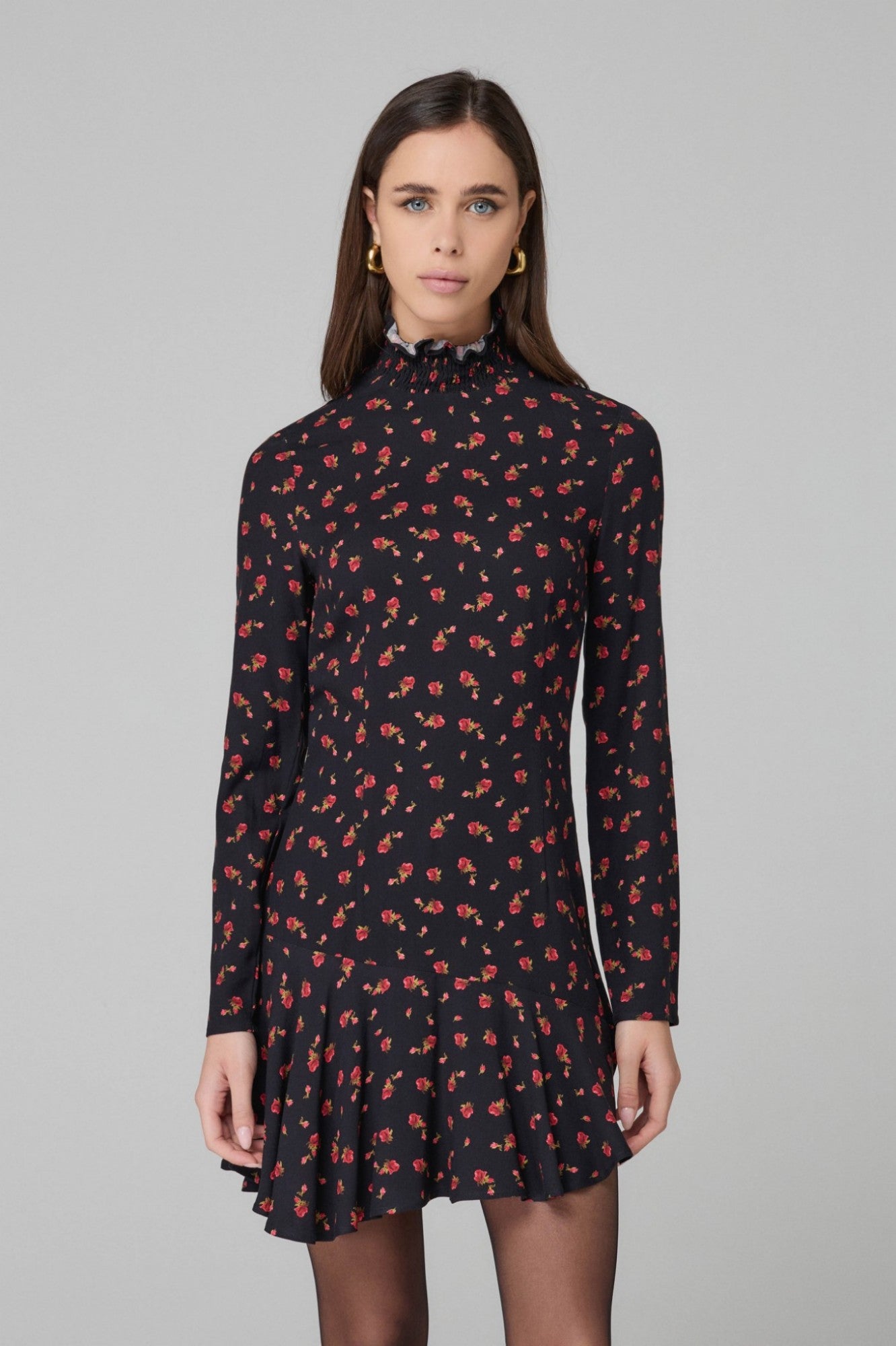 Abito corto asimmetrico in fantasia floreale su base nera o nella variante bordeaux con pois piccolo.