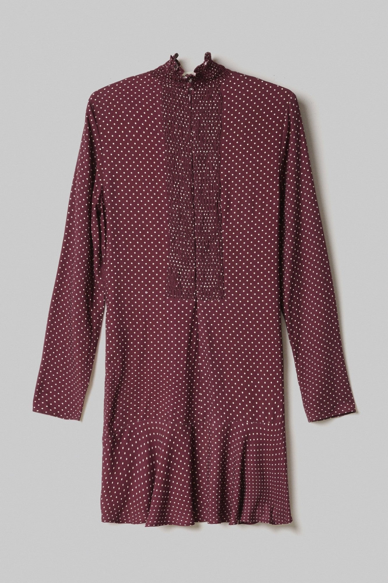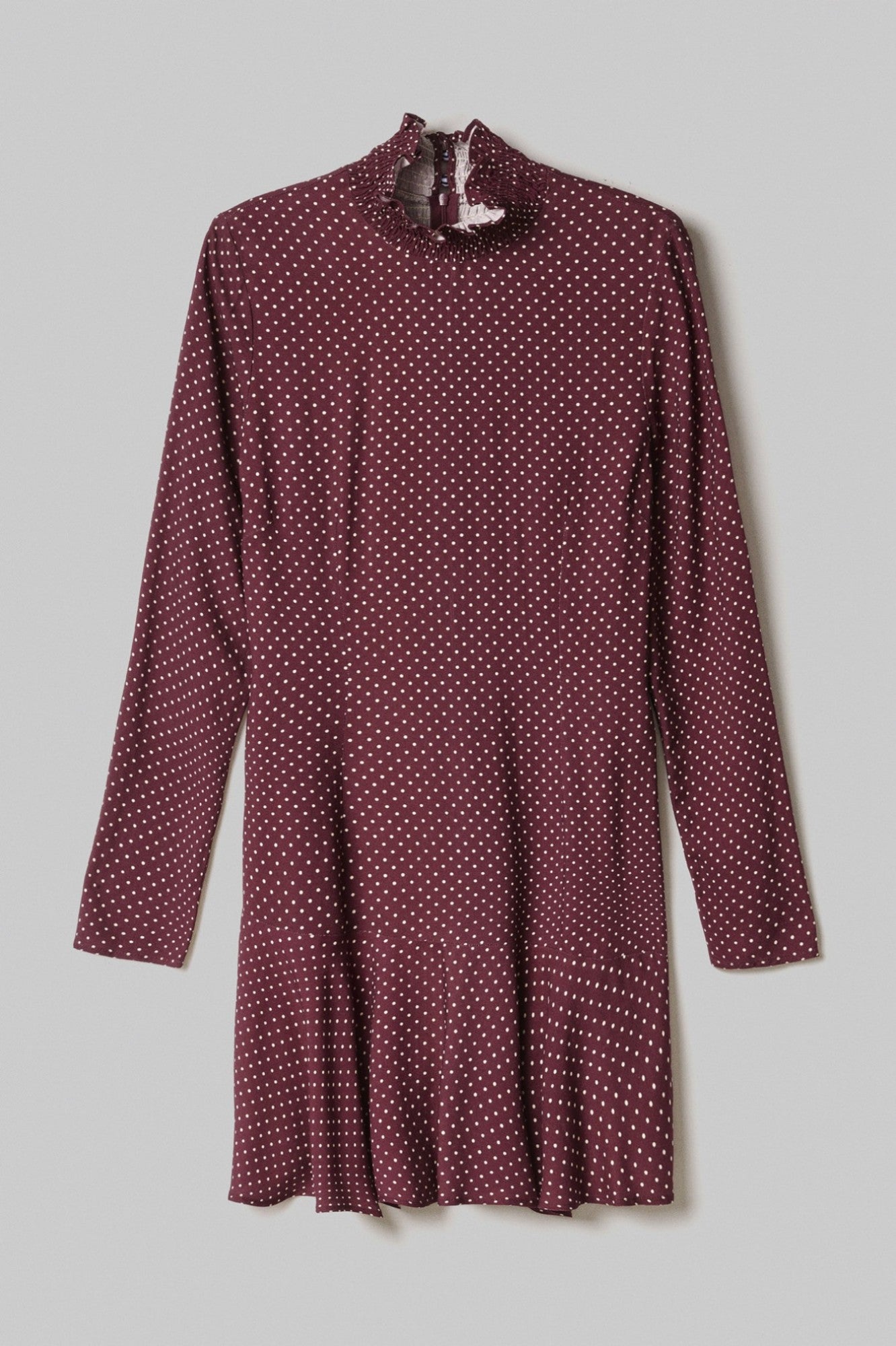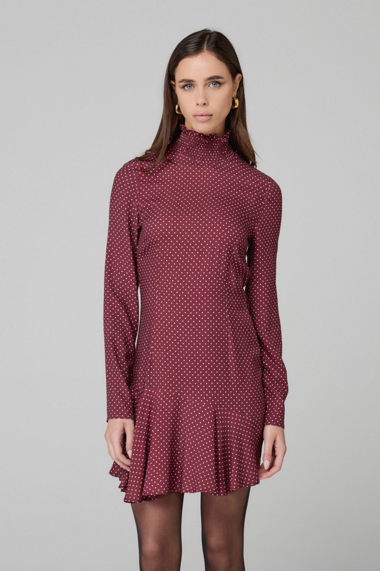 Abito corto con manica lunga e collo alto in 100% viscosa con fantasia di pois piccolo su base burgundy.