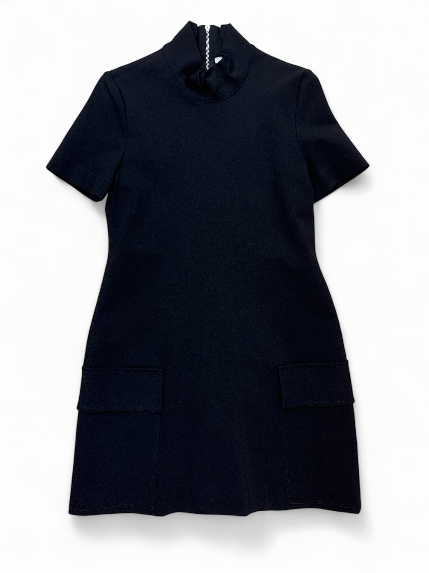 Il modello presenta un collo alto morbido, maniche corte e due tasche applicate frontali che aggiungono un tocco contemporaneo e funzionale. La chiusura con zip posteriore assicura una vestibilità pratica e impeccabile.