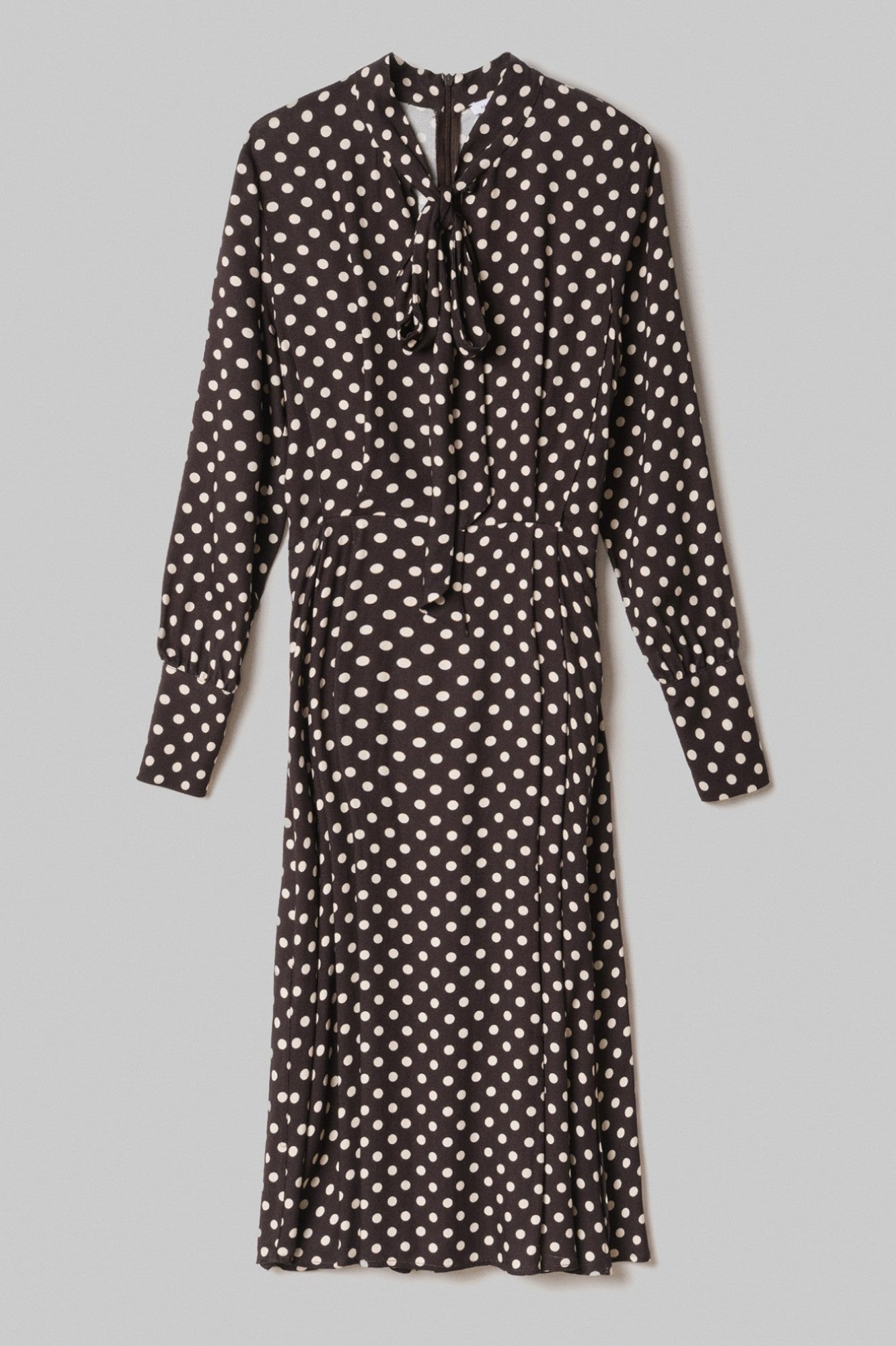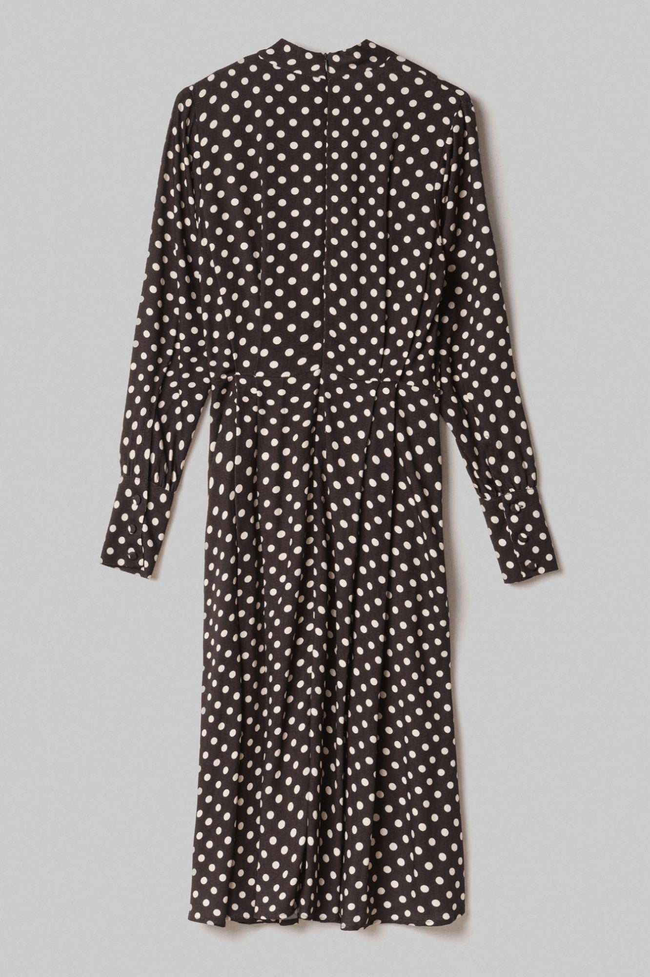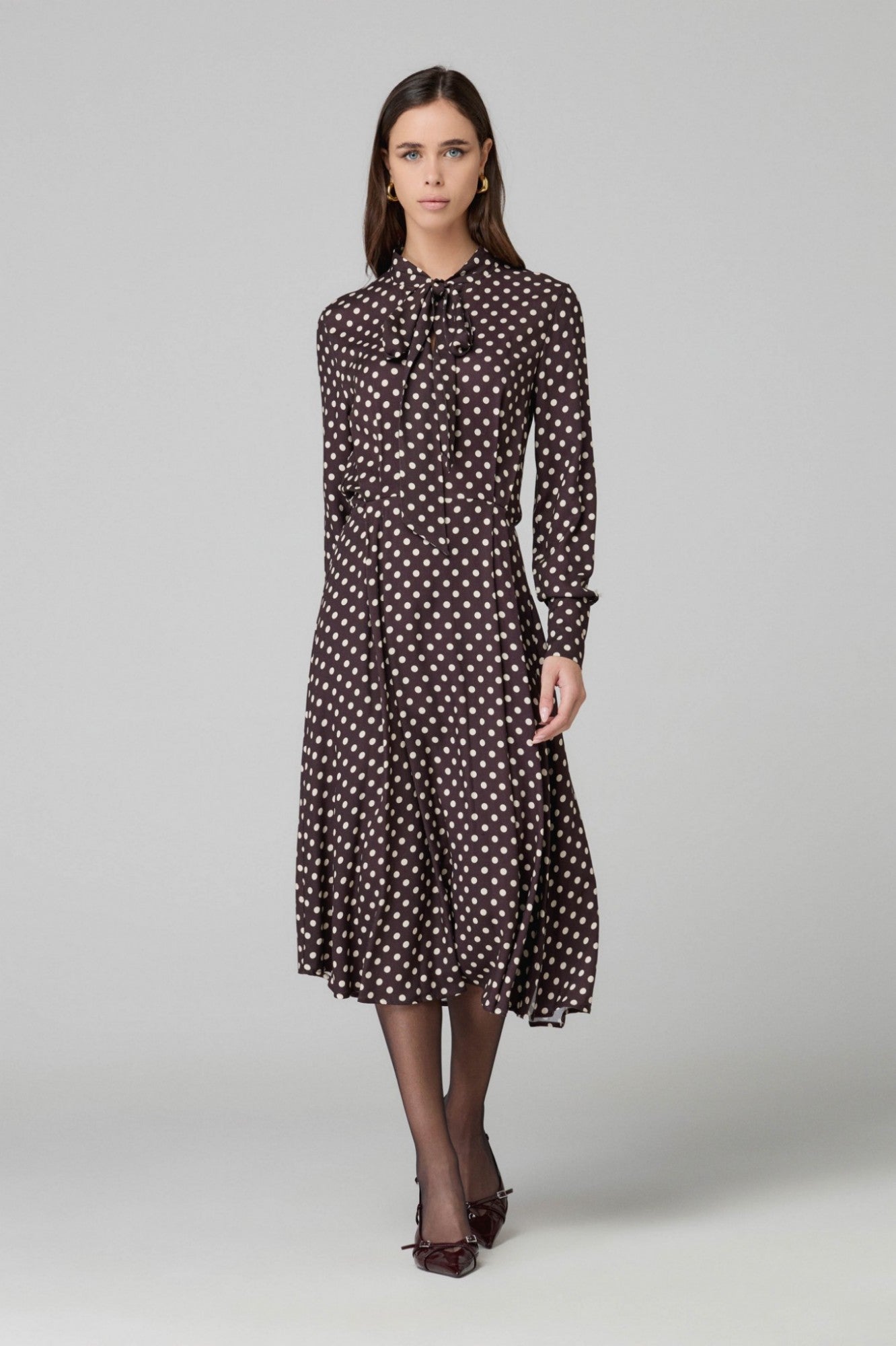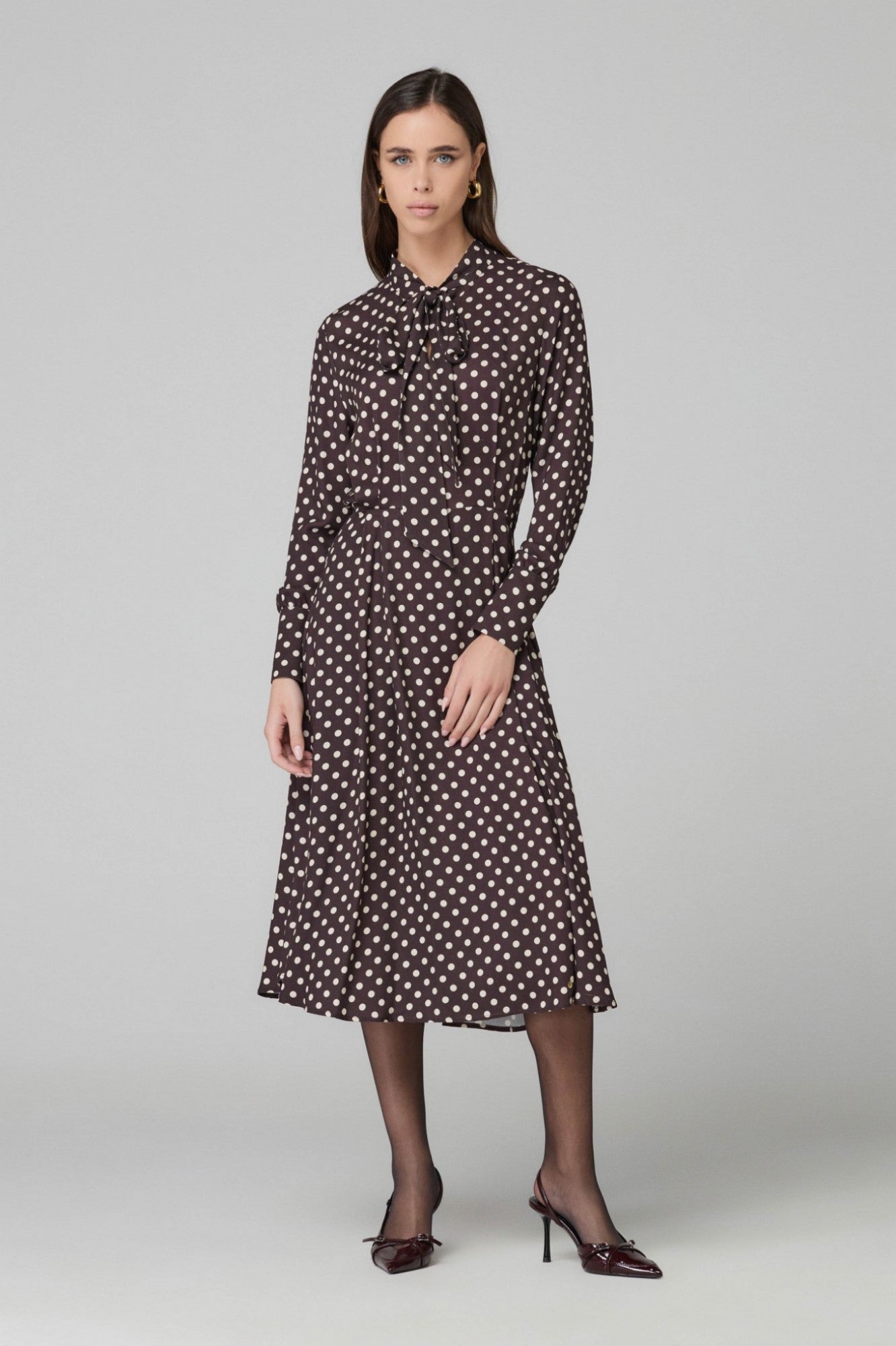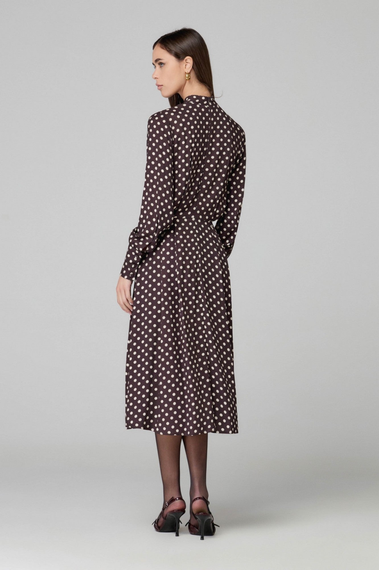 Abito midi con fusciacca a manica lunga a pois su base testa di moro.