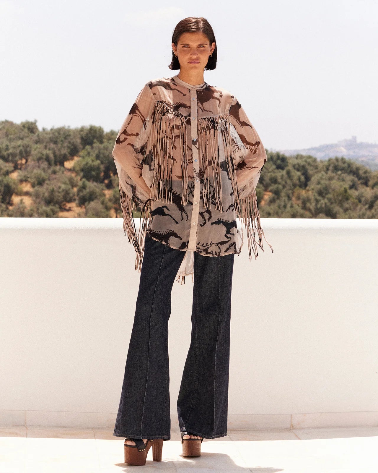 Camicia in chiffon di viscosa morbida e leggera, stampata con un motivo di ispirazione preistorica nei toni del beige e del marrone scuro. Le cuciture e i polsini sono rifiniti con una treccia intrecciata per una finitura artigianale. Dal petto, intricate frange simili a cordoncino cadono lungo la parte anteriore, aggiungendo consistenza e movimento. Un pezzo forte e fluido con una sensazione cruda e sofisticata.