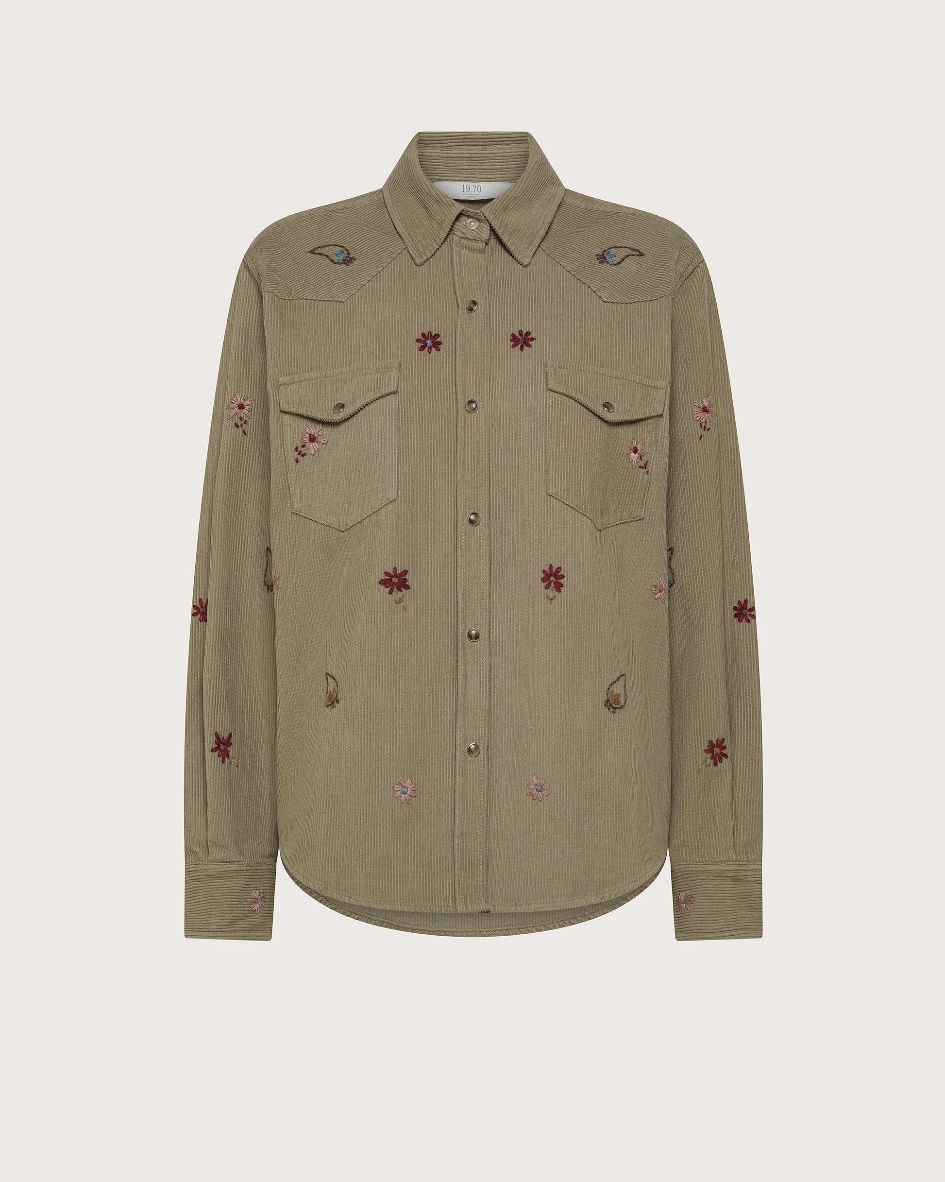 Camicia in velluto con dettaglio ricamo floreale, doppio taschino frontale con bottone.