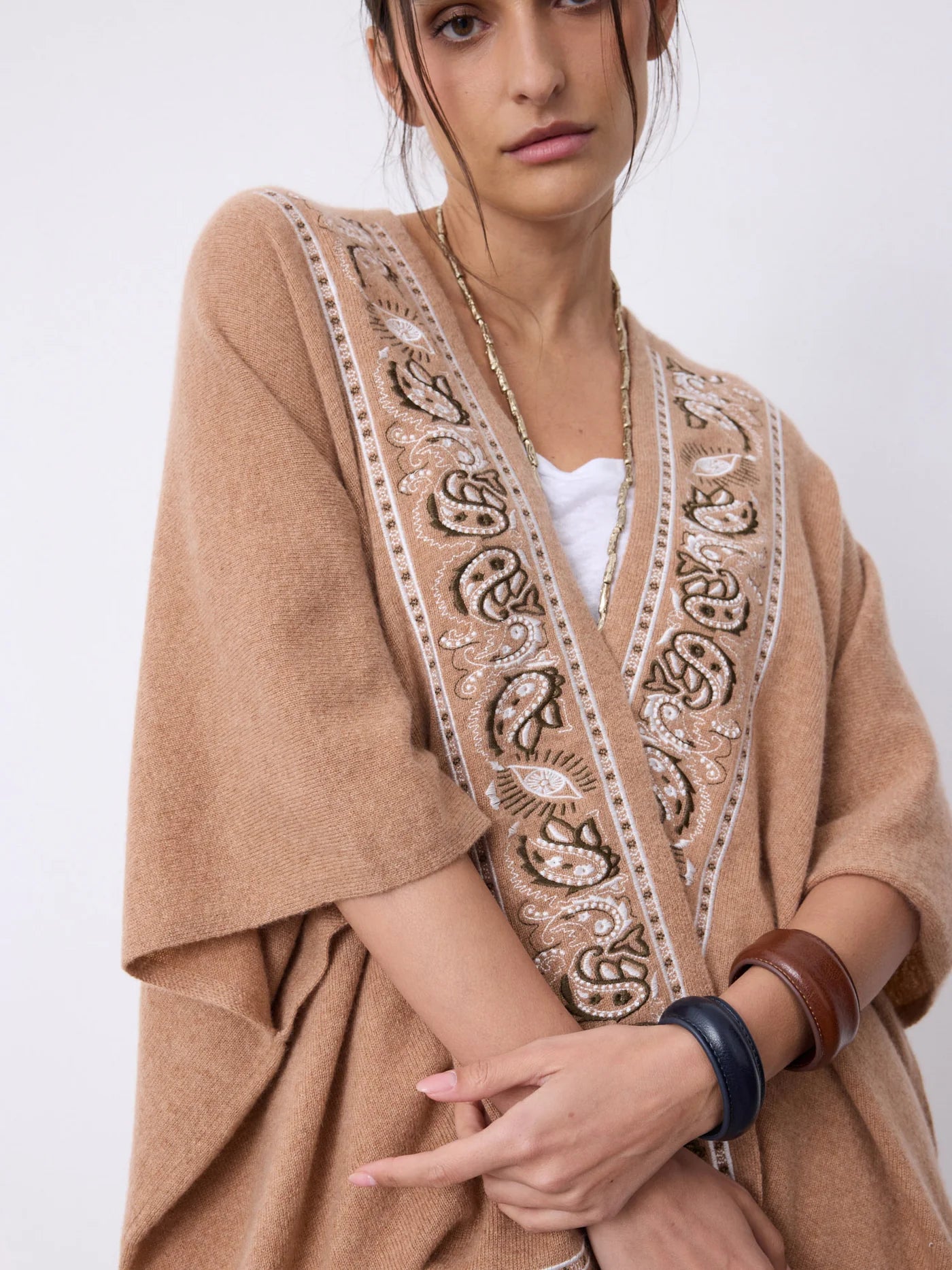 Cappa in puro cachemire con manica a tre quarti, aperta sul davanti e con bordatura ricamata in stile paisley. Vestibilità ampia.