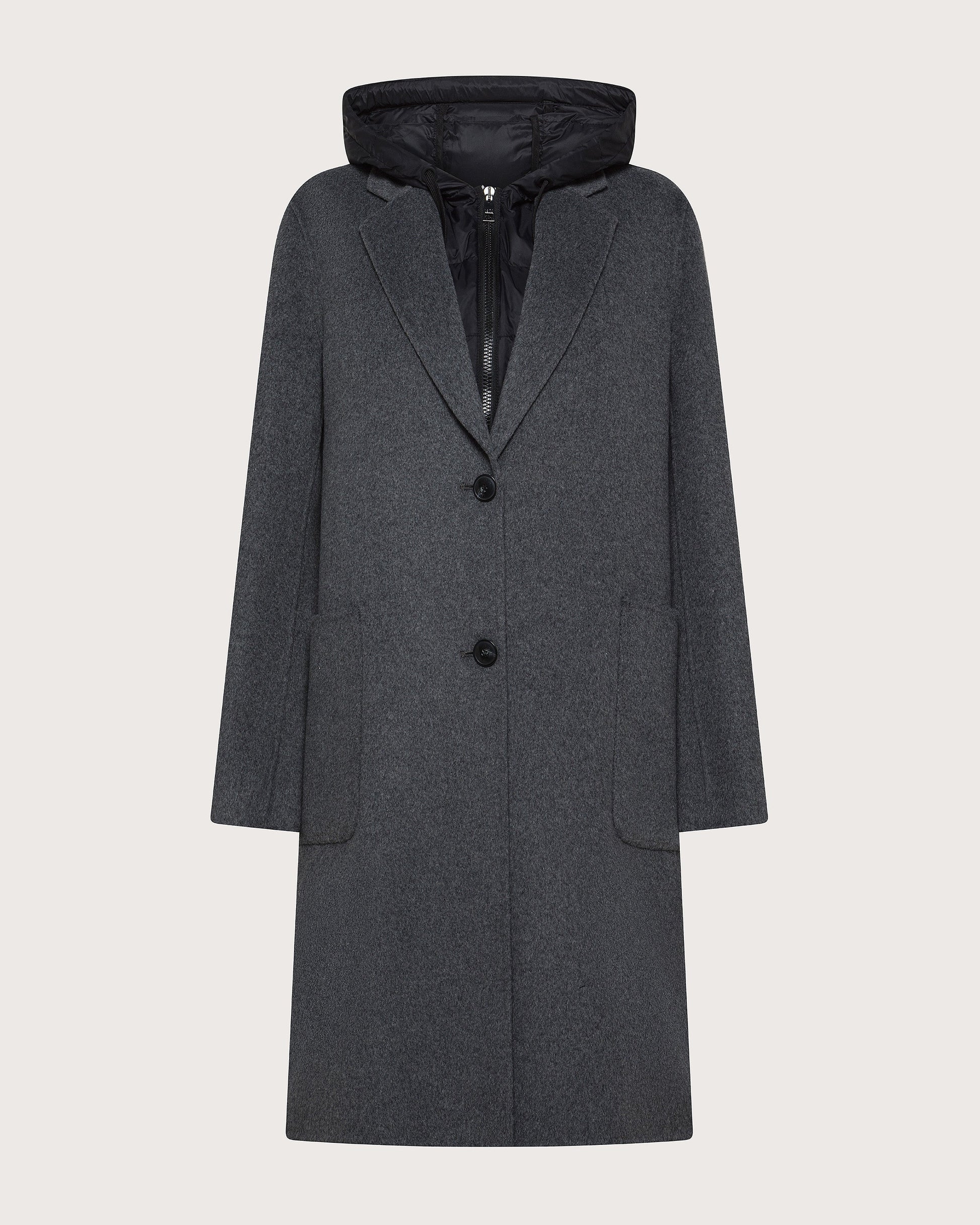 Cappotto in panno double con imbottitura interna smanicata, con cappuccio in finta piuma staccabile bicolor.
