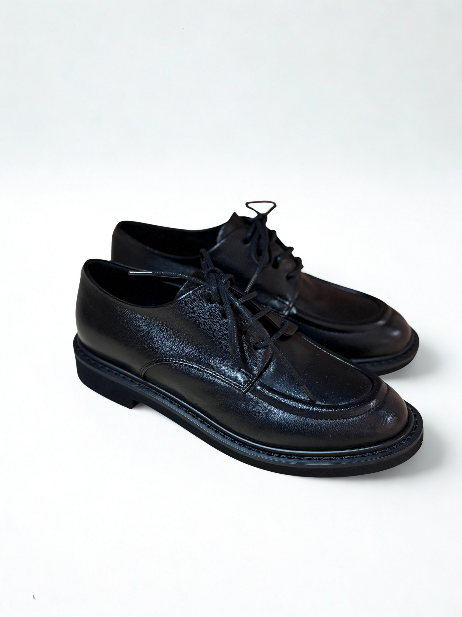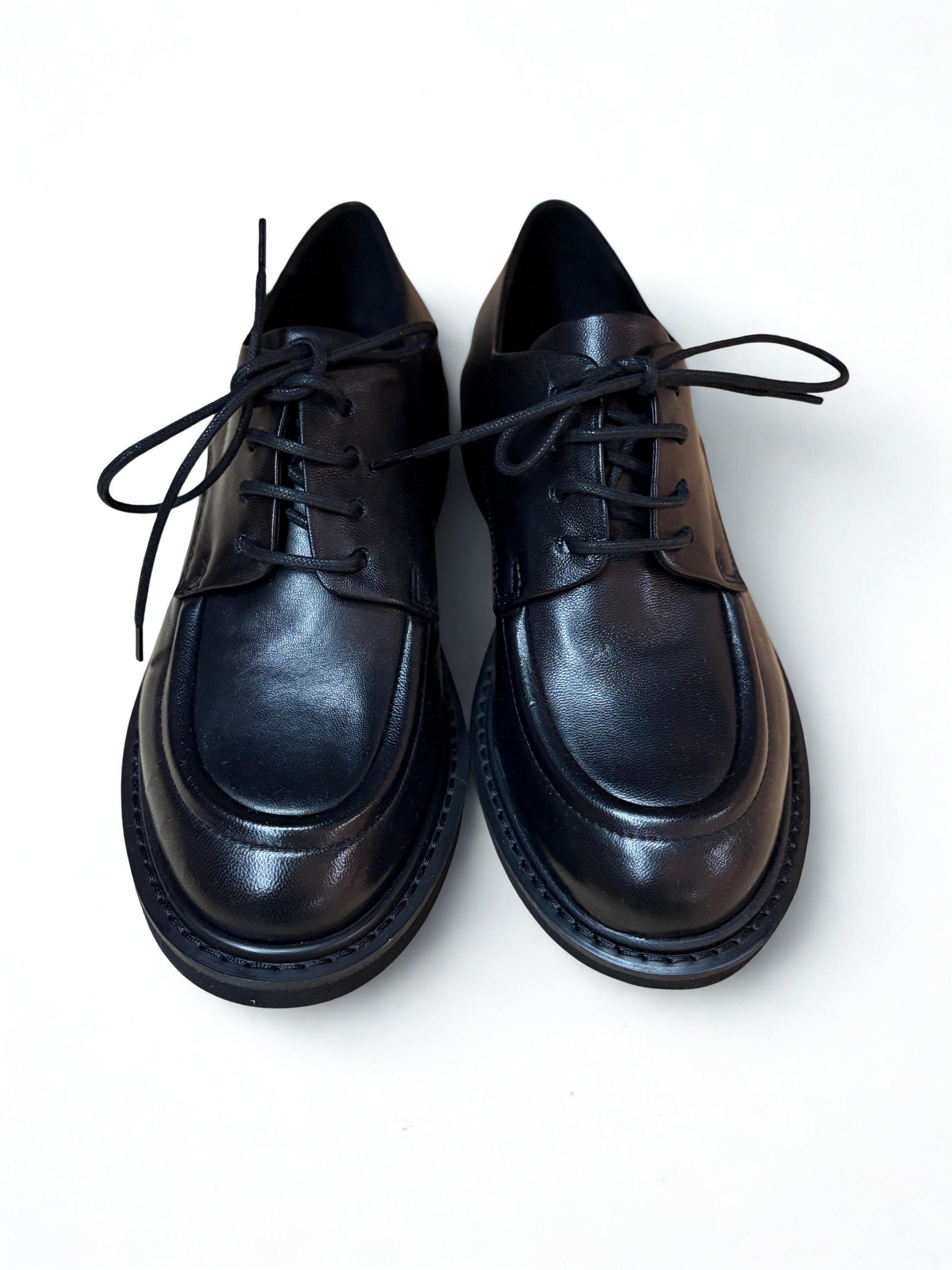 Un’eleganza essenziale che non passa inosservata. Queste scarpe Derby in pelle nera combinano linee pulite e dettagli sartoriali, con cuciture a rilievo che valorizzano la forma arrotondata della punta. Il design minimale e contemporaneo le rende perfette per ogni occasione — dal look formale all’outfit urbano più ricercato.