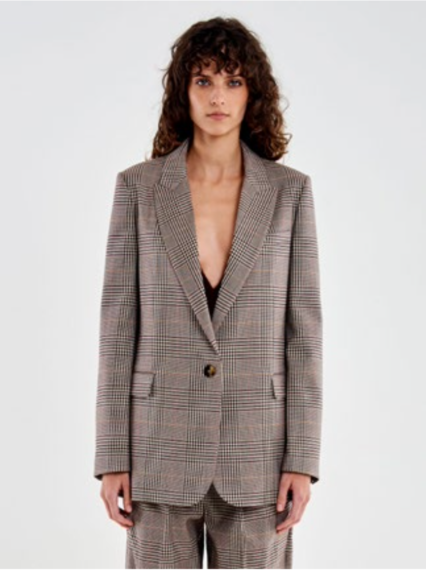 Il design presenta revers a lancia, chiusura monopetto con un bottone e tasche con patta, dettagli che richiamano la tradizione sartoriale. Il tessuto Principe di Galles, nelle tonalità del marrone e del grigio con sottili accenti di Borgogna, conferisce un’eleganza sofisticata e versatile, perfetta per l’ufficio o per un outfit casual-chic.