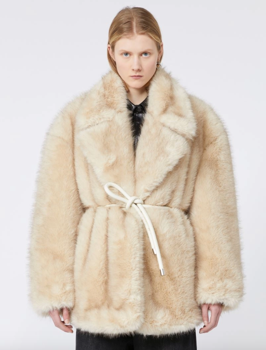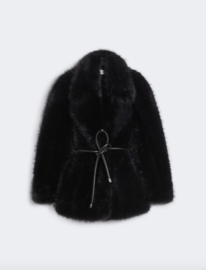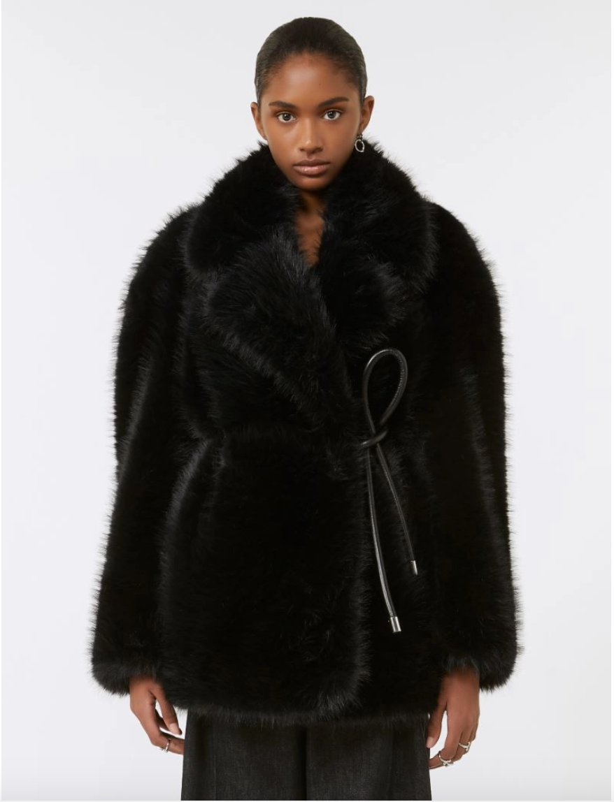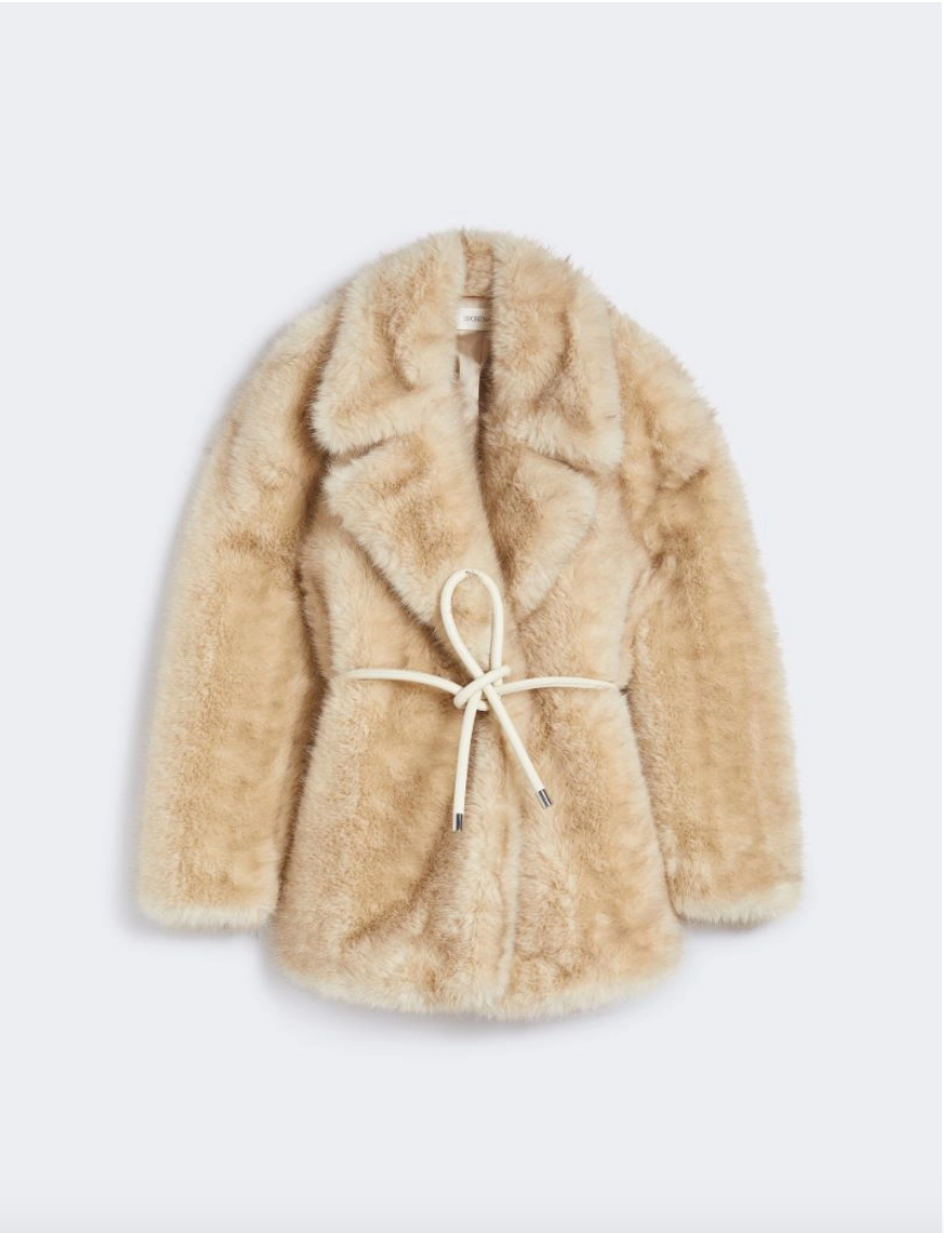 Giaccone morbido in tessuto dall'effetto furry, con rever ampio e cintura coordinata per stringere il punto vita.