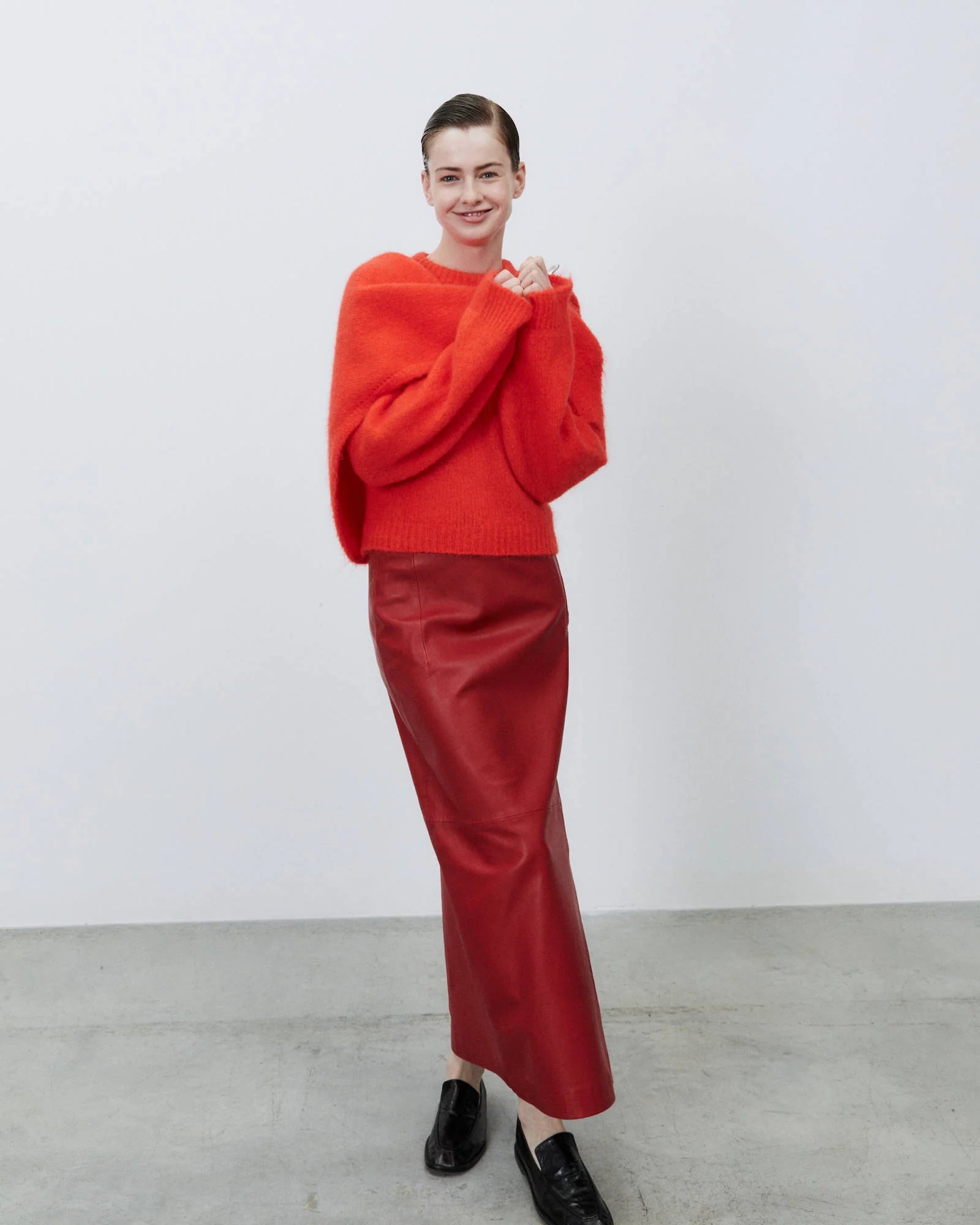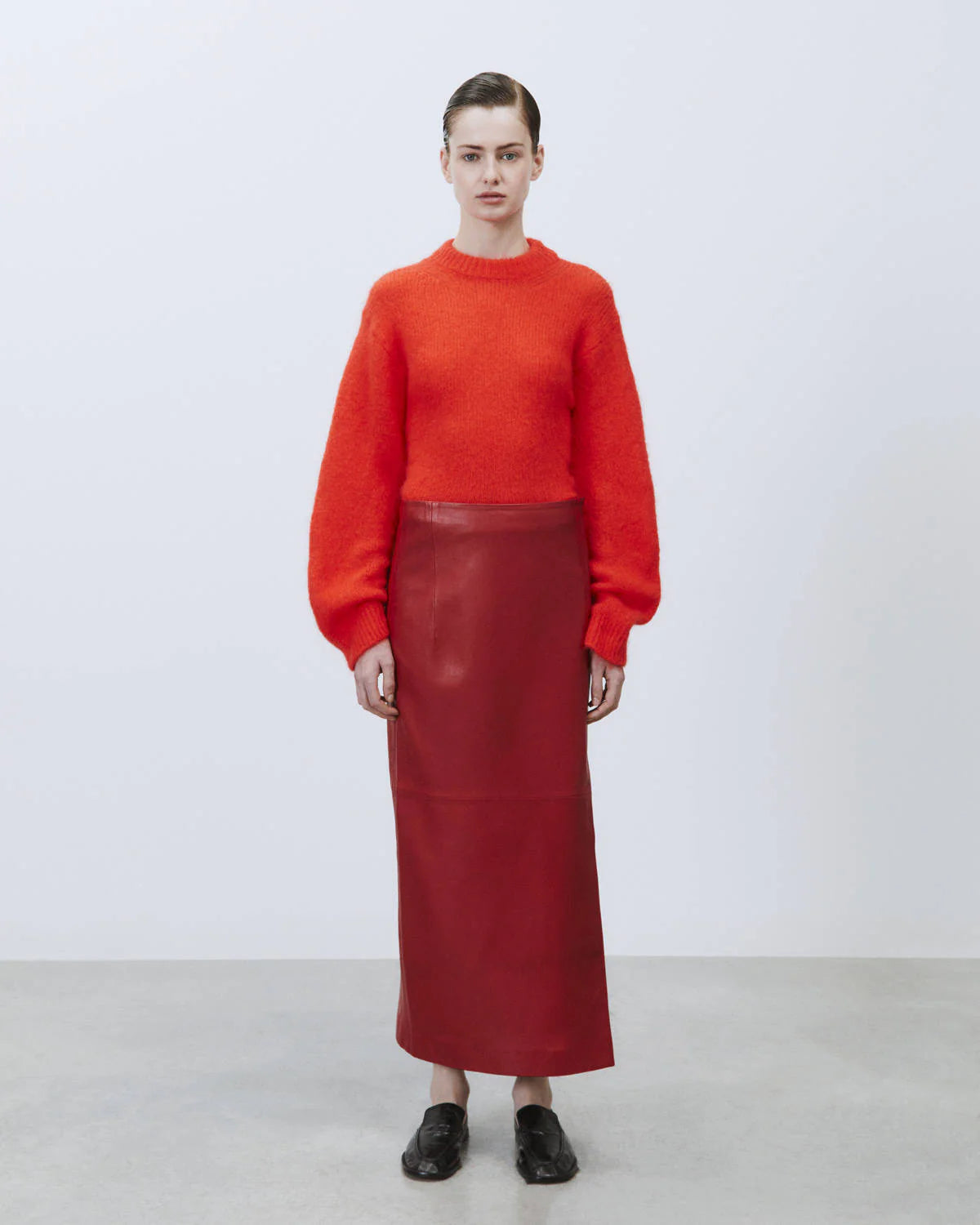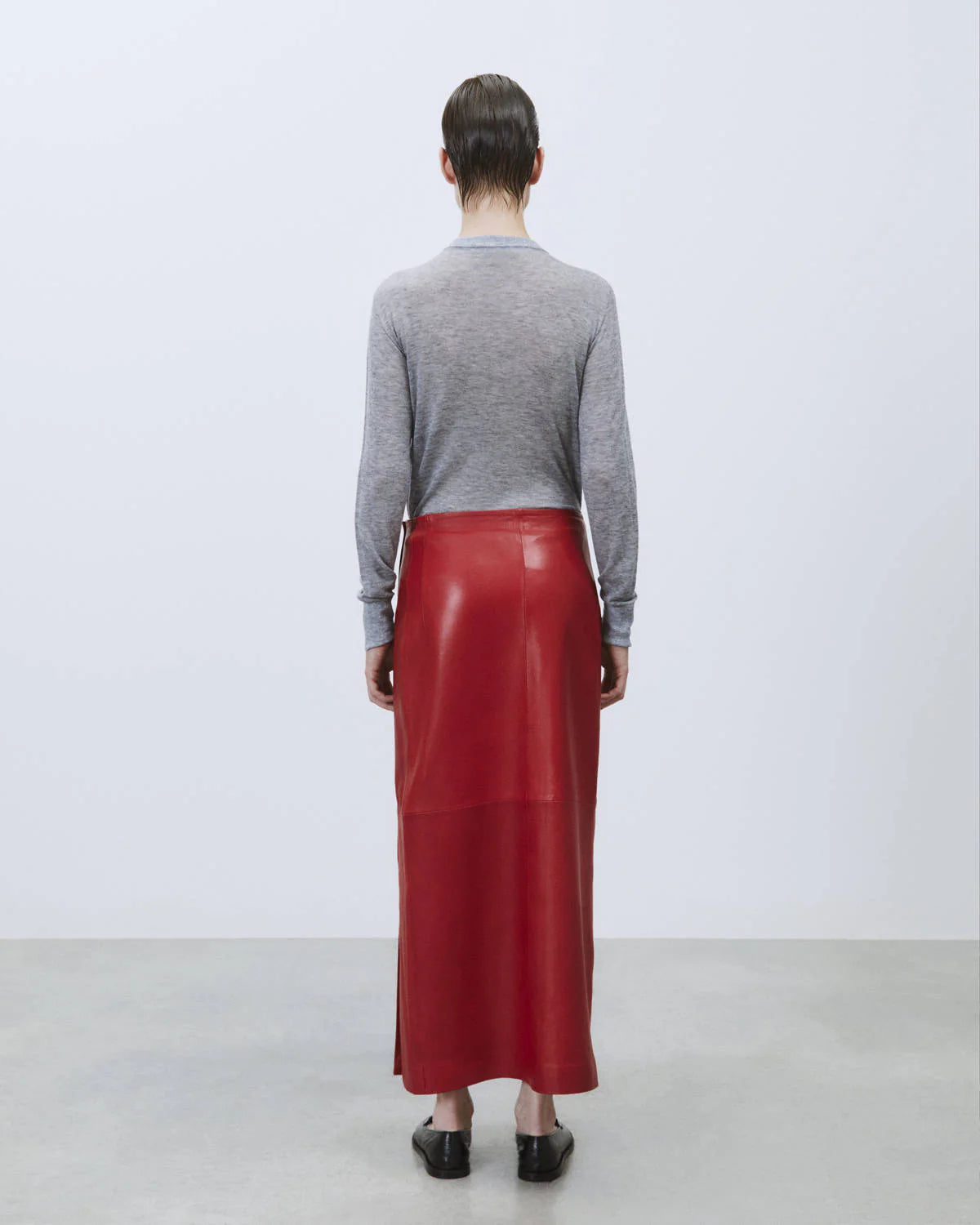 Longuette in vera pelle rossa con spacco sul tre quarti frontale, cerniera laterale, vita pulita senza inserti né tasche.