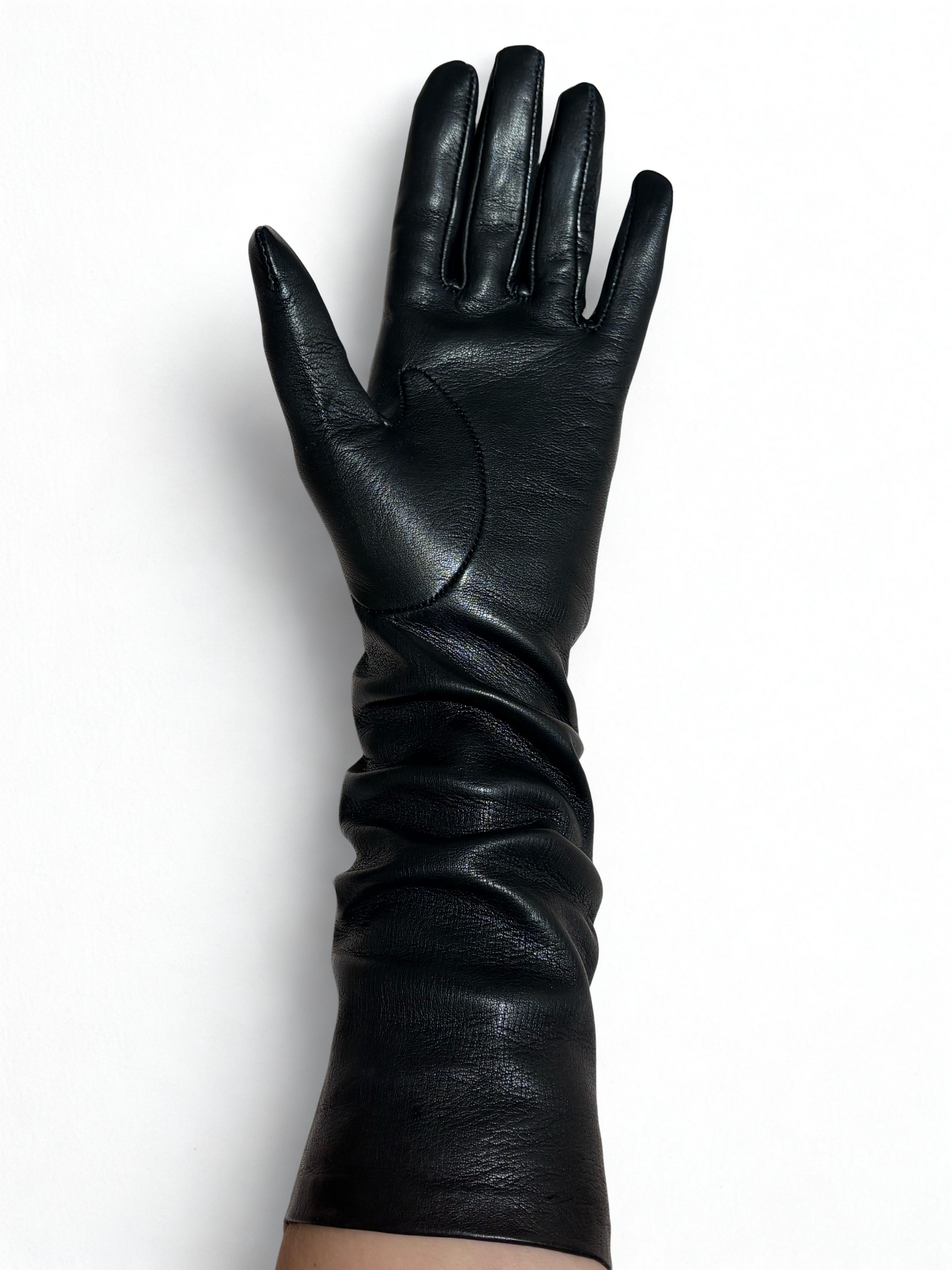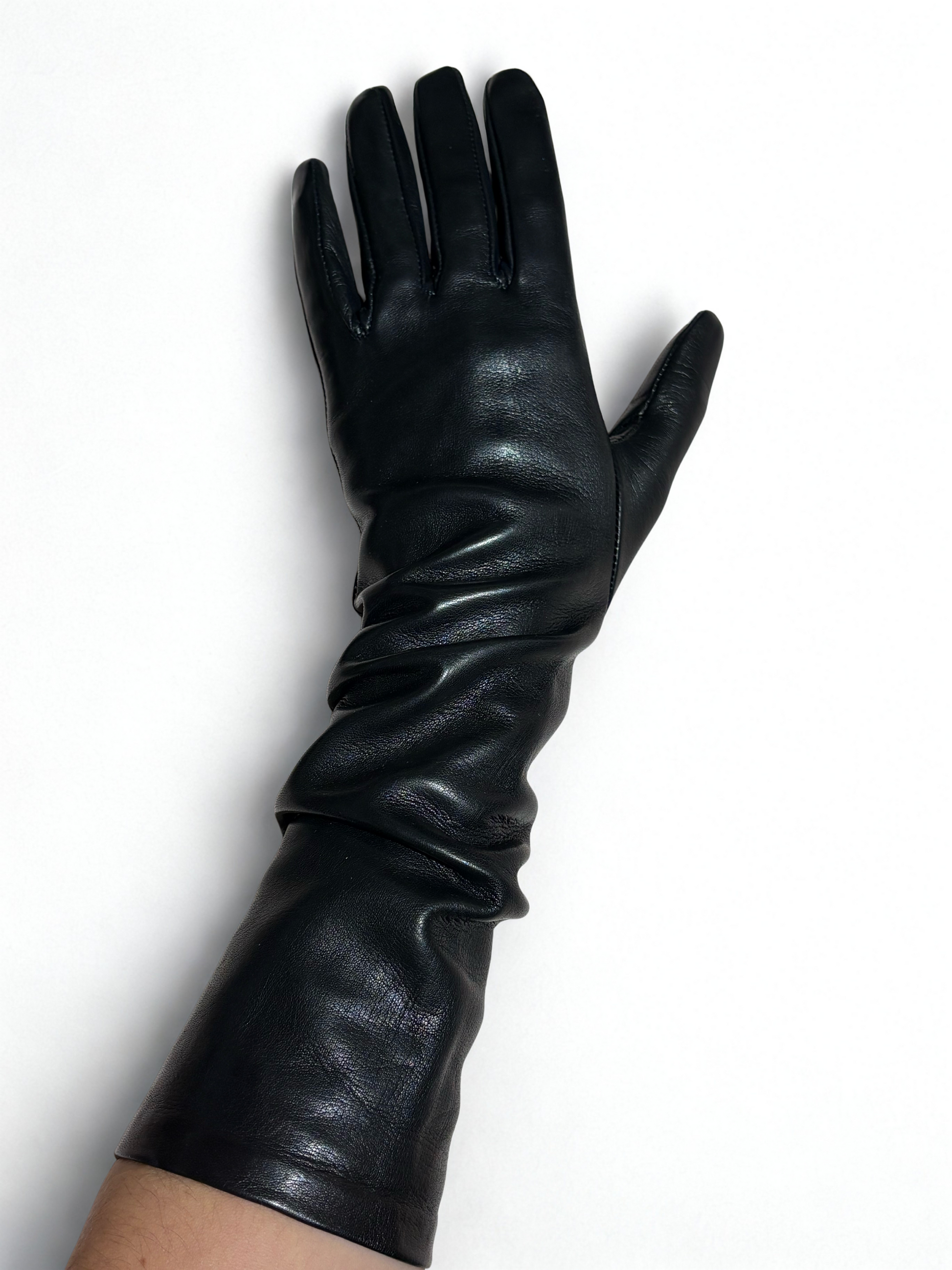 Realizzati in morbida pelle nera di alta qualità, questi guanti lunghi uniscono raffinatezza e praticità. Il design slanciato fino a metà braccio donano un tocco sofisticato e femminile, perfetto per completare look eleganti o da sera.