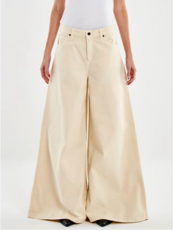 Pantalone in bull di cotone leggero con gamba larga, classico taglio jeans cinque tasche, confortevole e morbido.
