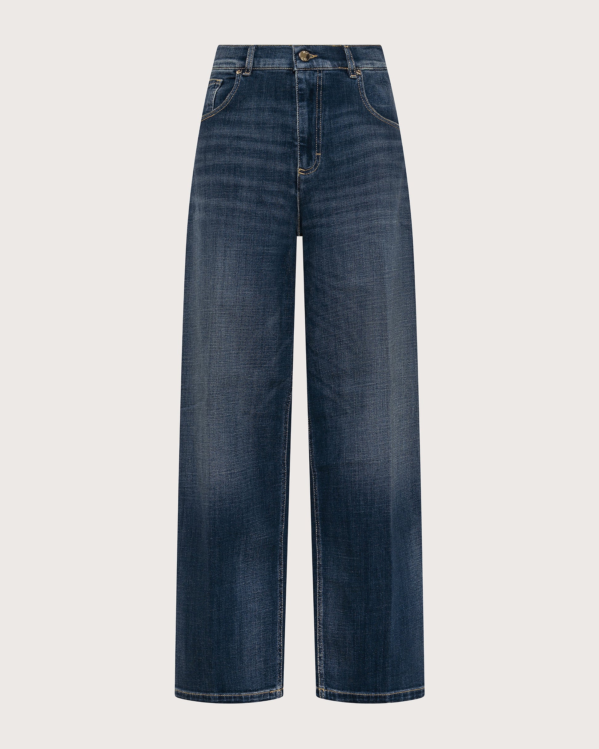 Jeans a vita alta con cinque tasche in denim slegato washed. Gamba dritta e ampia. Chiusura frontale con cerniera e bottone.