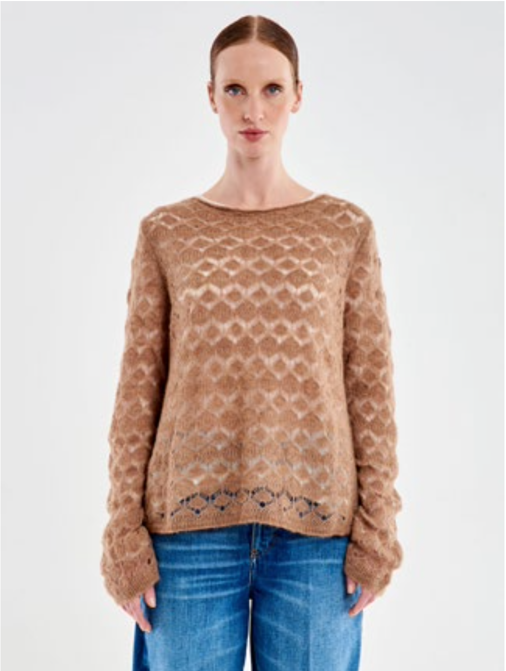 Un gioco di texture e trasparenze per un look sofisticato e contemporaneo. Questo maglioncino traforato in lana e alpaca, caratterizzato da un delicato motivo geometrico, è abbinato a una blusa in crêpe leggera per un effetto stratificato elegante e femminile. Il filato soffice e leggermente vaporoso regala comfort e calore, mentre il design raffinato lo rende perfetto sia per il giorno che per la sera.