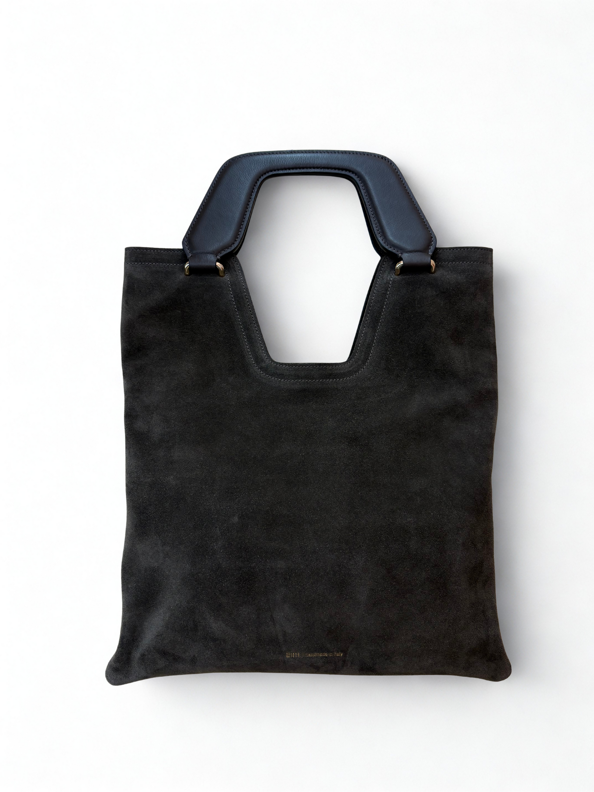 Eleganza essenziale e design contemporaneo si incontrano in questa borsa in morbida pelle scamosciata dal carattere sofisticato. Il modello si distingue per i manici strutturati in pelle liscia, dalla linea geometrica e moderna, che aggiungono un tocco architettonico al design pulito.