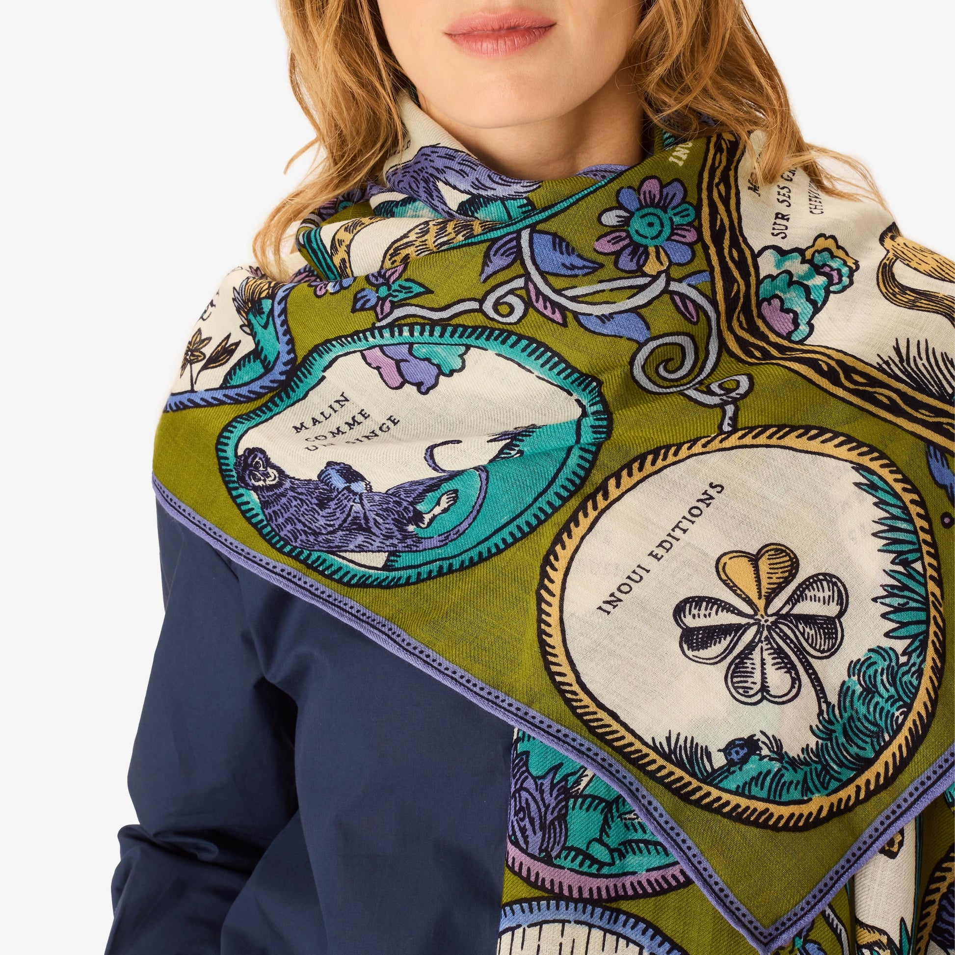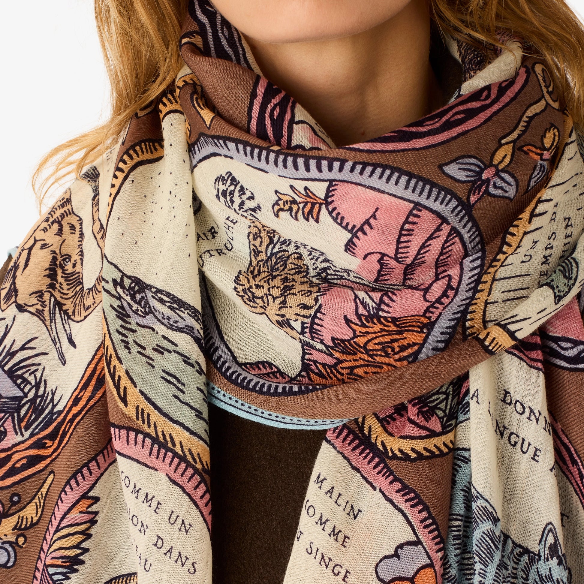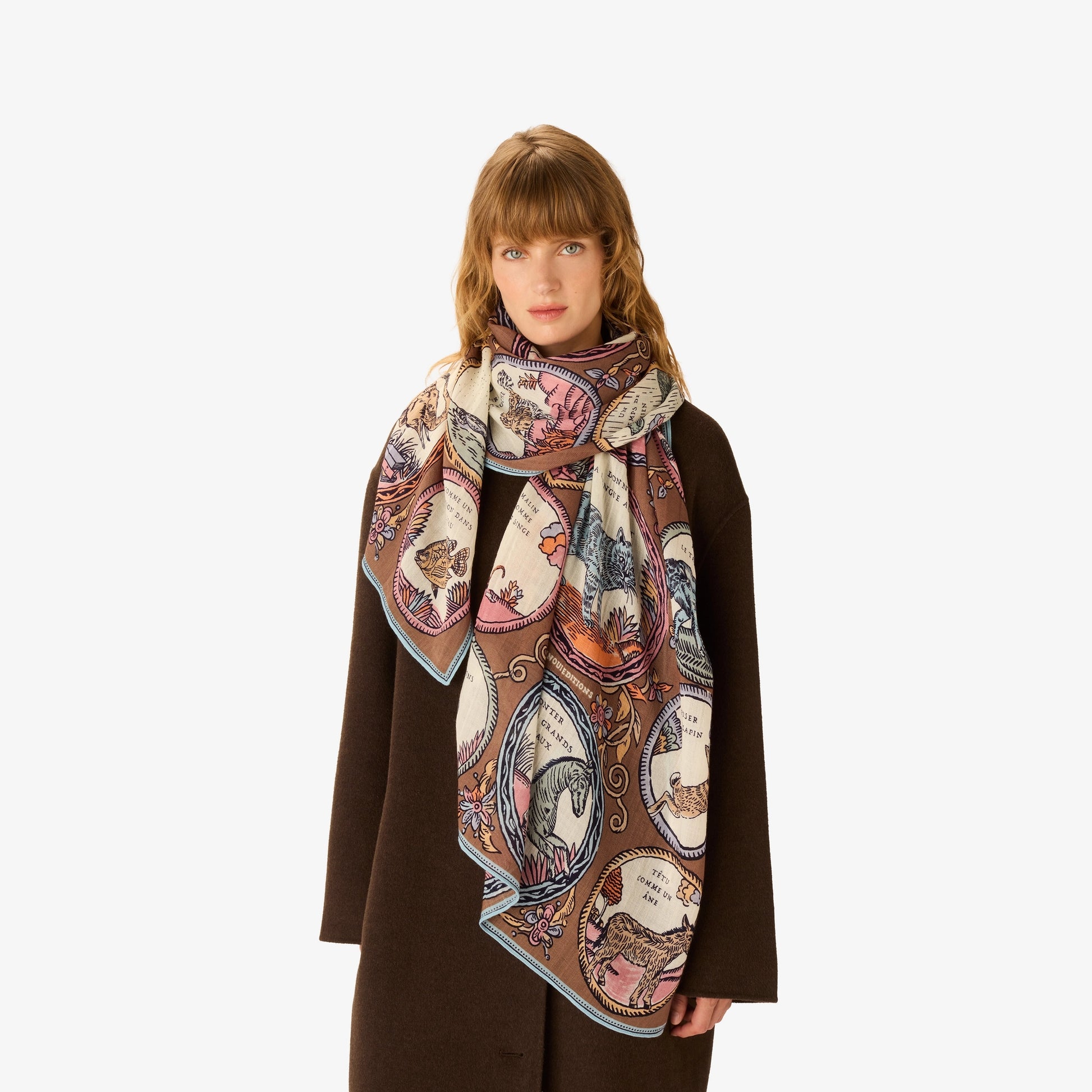 Questa linea di sciarpe stampate a mano è disponibile in diverse taglie a seconda dei disegni. Morbida e ideale per l'inverno, la lana ha la particolarità di essere lavabile.