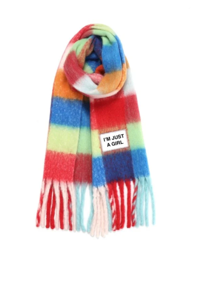 Le vivaci fasce multicolor nei toni del rosso, blu, verde, arancio e panna accendono ogni look invernale, mentre le frange soffici e la patch “I’m Just a Girl” aggiungono un tocco giovane e deciso.