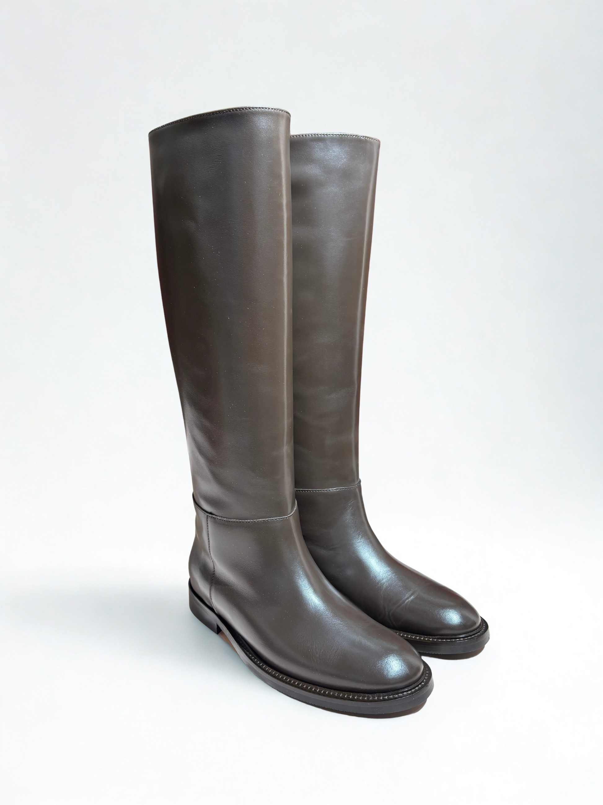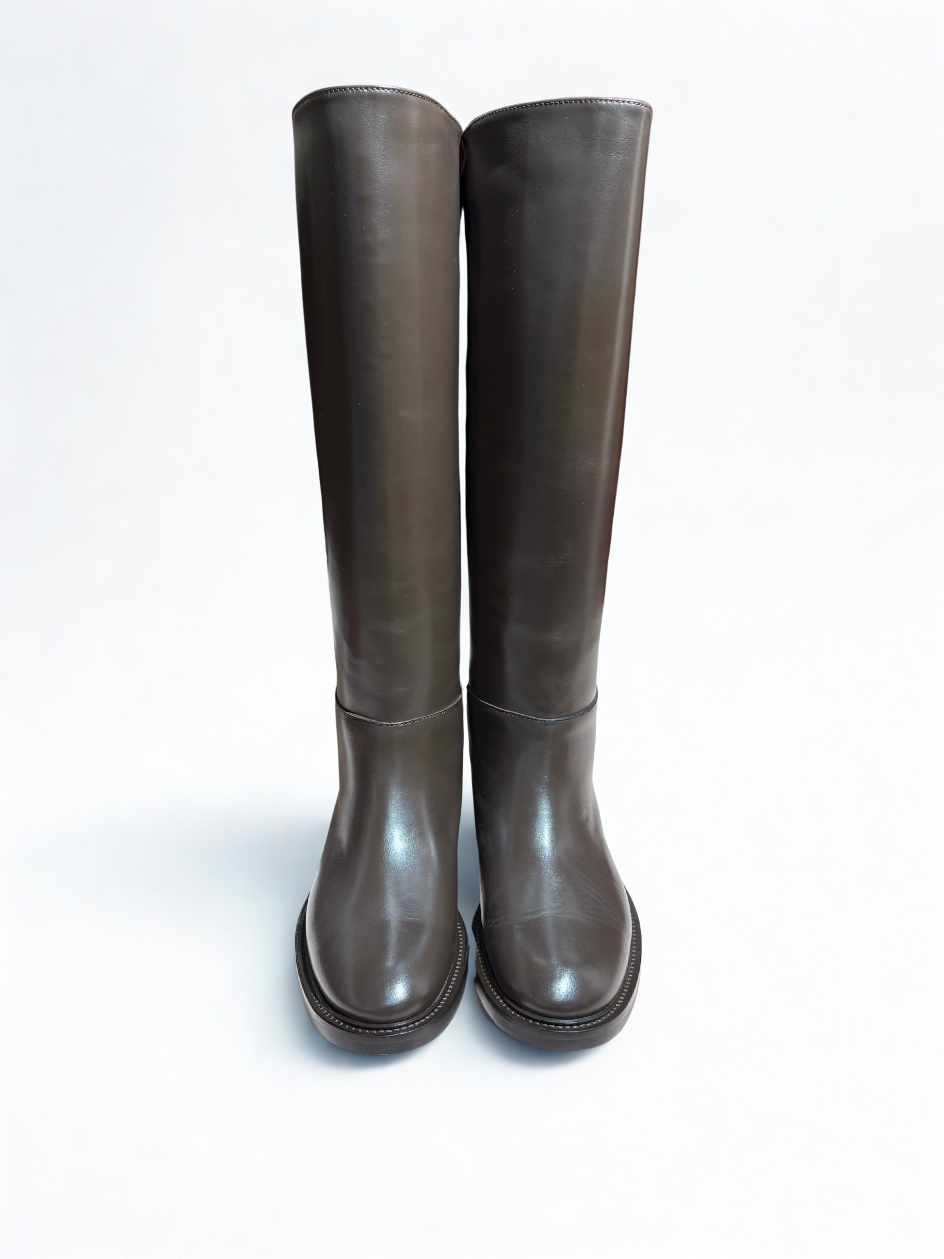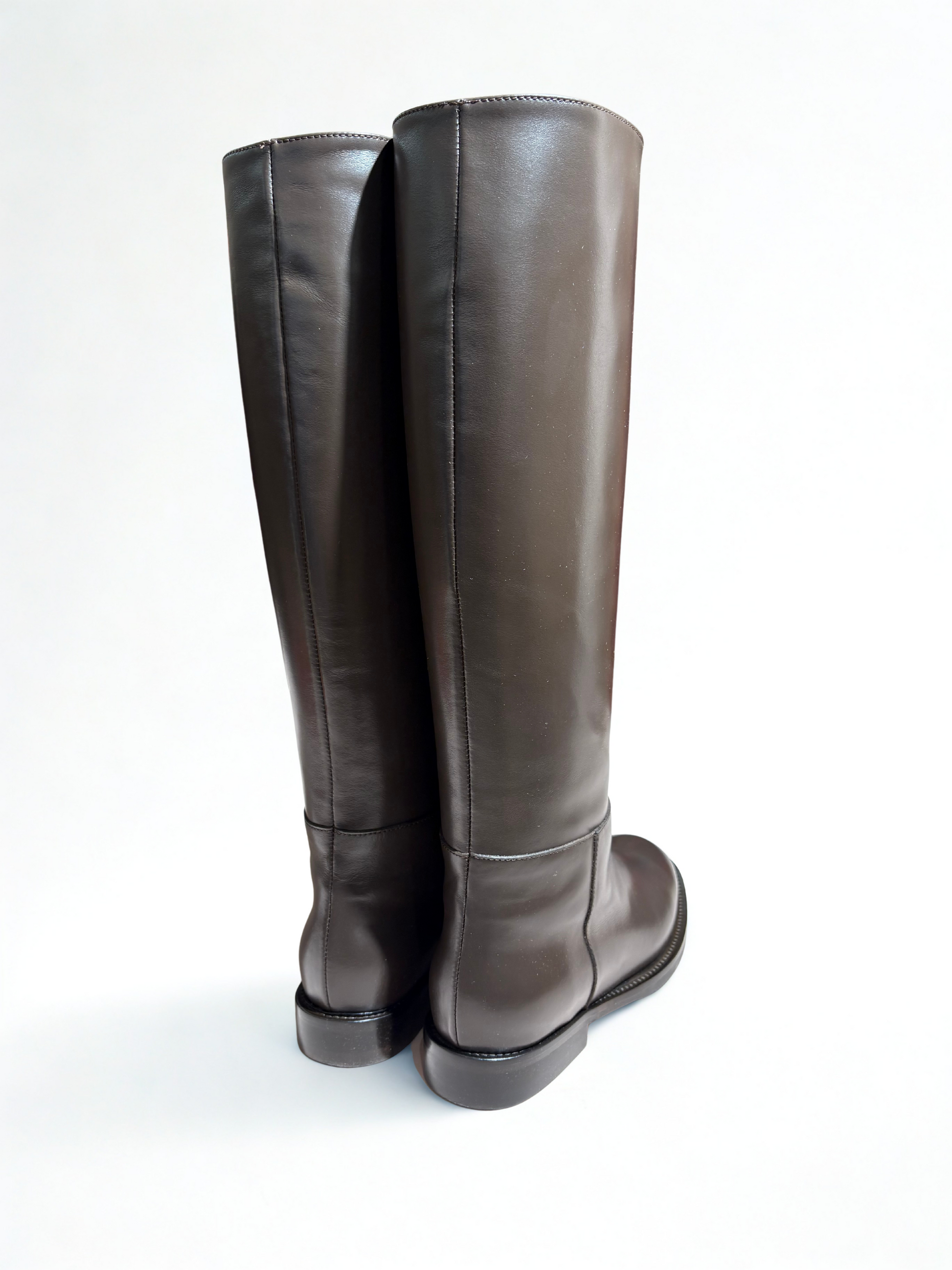 Essenziali, eleganti e senza tempo — questi stivali alti in pelle marrone scuro sono un must-have del guardaroba femminile. Realizzati in morbida pelle di alta qualità, presentano una linea pulita e minimale che valorizza ogni outfit, dal più casual al più sofisticato. La suola piatta con cuciture a vista garantisce comfort e durata, mentre la silhouette slanciata aggiunge un tocco raffinato e contemporaneo.