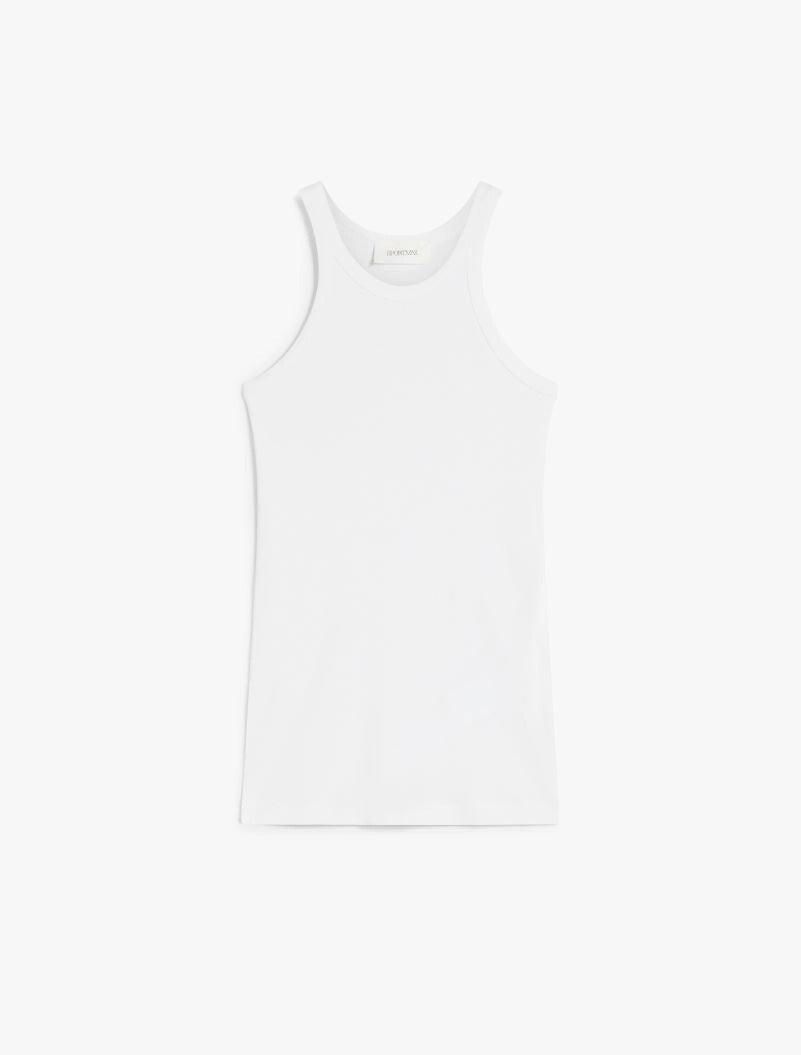 Canotta realizzata in filato di misto seta lavorata a costine. Scollo stondato davanti e dietro con taglio all'americana sulle spalle. Fit femminile che disegna sulla silhouette. Vestibilità regolare